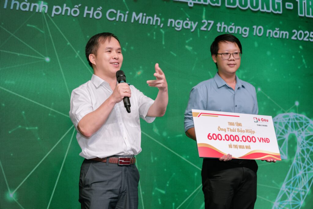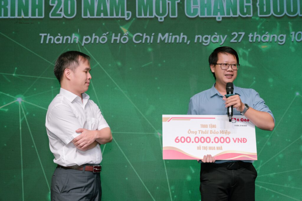 Trong khuôn khổ Lễ kỷ niệm 20 năm thành lập diễn ra ngày 27/10/2025, Công Ty Cổ Phần Dịch Vụ Bồ Câu đã trao tặng 600.000.000 đồng cho ông Thái Bảo Hiệp nhằm hỗ trợ mua nhà, giúp anh ổn định cuộc sống và yên tâm công tác lâu dài.